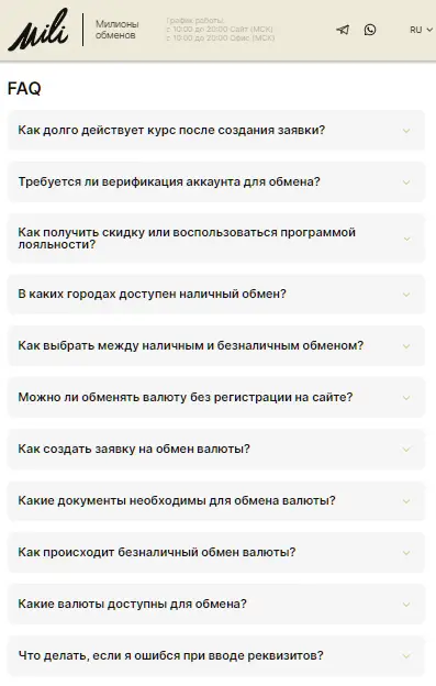 Когда возникают вопросы про сроки выполнения обмена, о регистрации на сайте, размере комиссий, безопасности, верификации и доступности сервиса в разных странах и городах, на помощь приходят ответы в разделе FAQ, в котором отражена вся необходимая информация на сайте обменного сервиса Mili.
