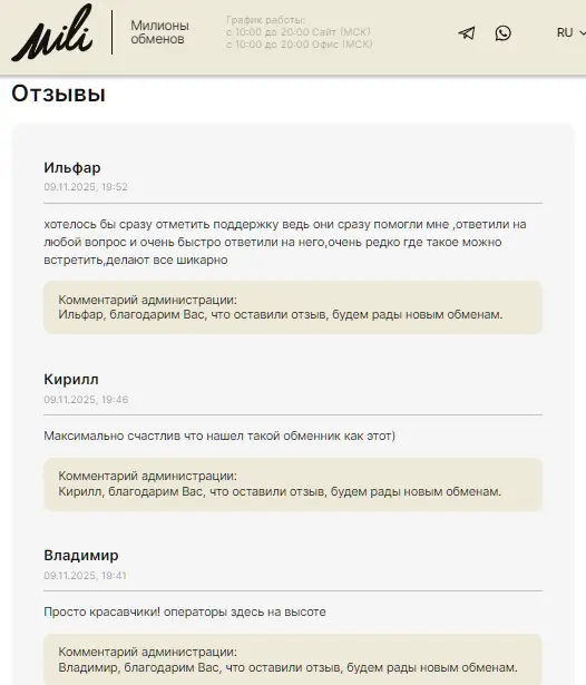 Уровень репутации обменного сервиса Mili достаточно высок, а отзывы на его сайте преимущественно положительные. Пользователи отмечают безопасность и прозрачность этапов обмена, множество безналичных направлений, привлекательные курсы валют, скорость обработки заявок, удобство и простоту использования сайта. Как одно из замечаний — редкие задержки из-за сетевой нагрузки.
