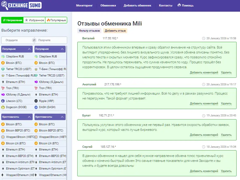 Также, по мнению мониторинга ExchangeSumo, Mili — это безопасный и удобный обменник с высокоскоростными операциями обмена и безопасностью на серьёзном уровне, подходящий для пользователей с любым опытом в данной сфере. Сервис отличается конкурентными преимуществами, среди которых выделяются выгодные курсы, доступные невысокие комиссии, слаженная работа команды. Об этом свидетельствуют отзывы и на сайте Exchangesumo.