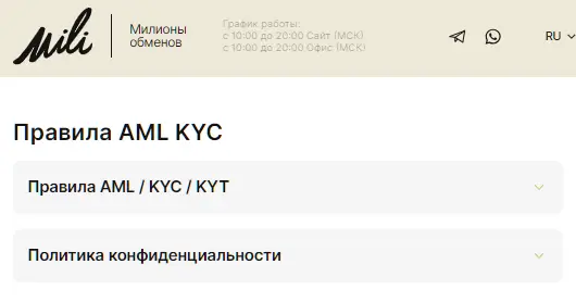| Контакты | info@miliex.online — поддержка по E-mail mili_support — поддержка в Telegram whatsapp_support — поддержка в Whatsapp miliex_bot — бот для совершения обменов форма обратной связиlivechat — на сайте |